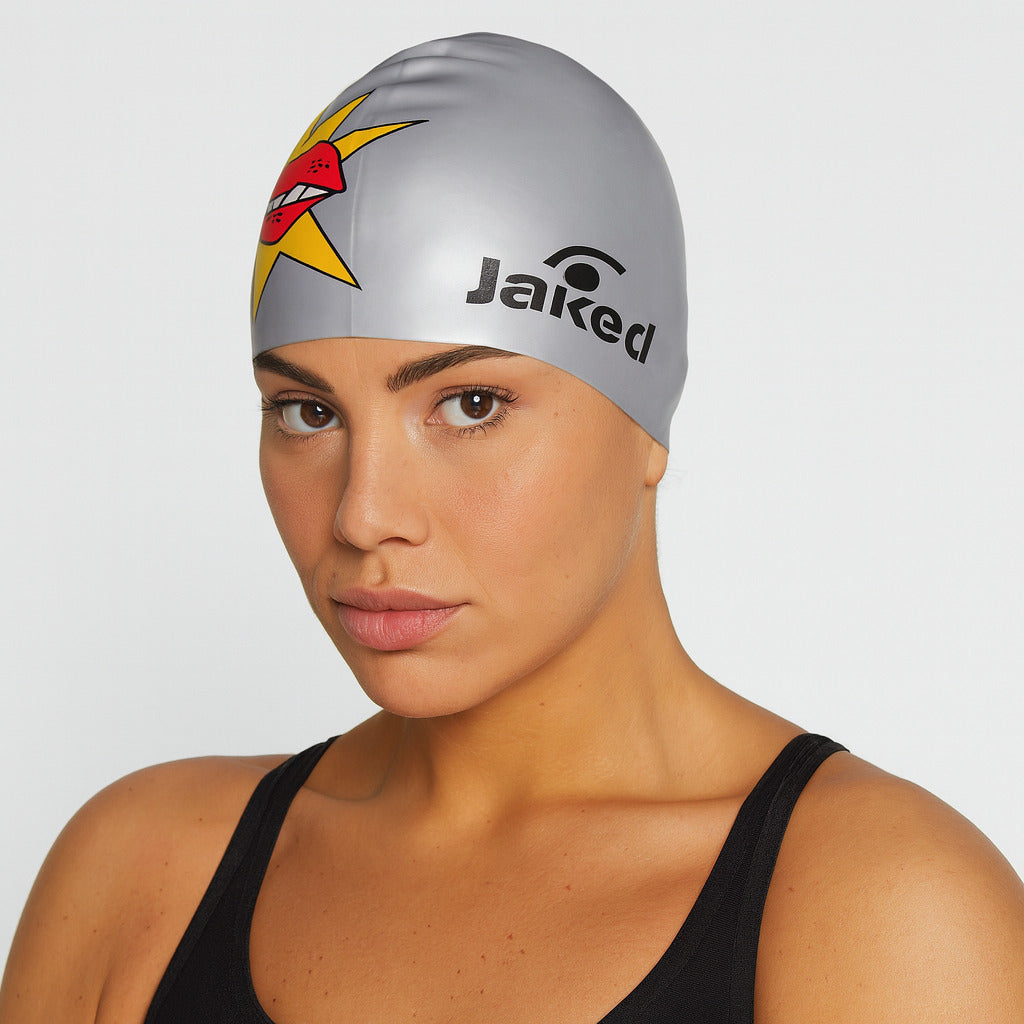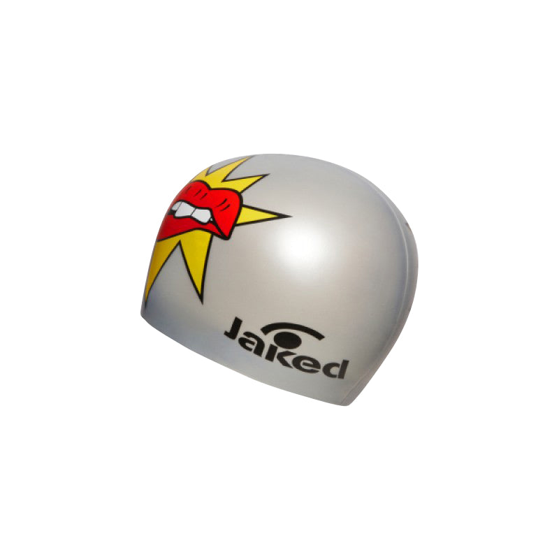Casca de inot din silicon KISS colorata, cu o imprimare originala si logo-ul Jaked pe fata.