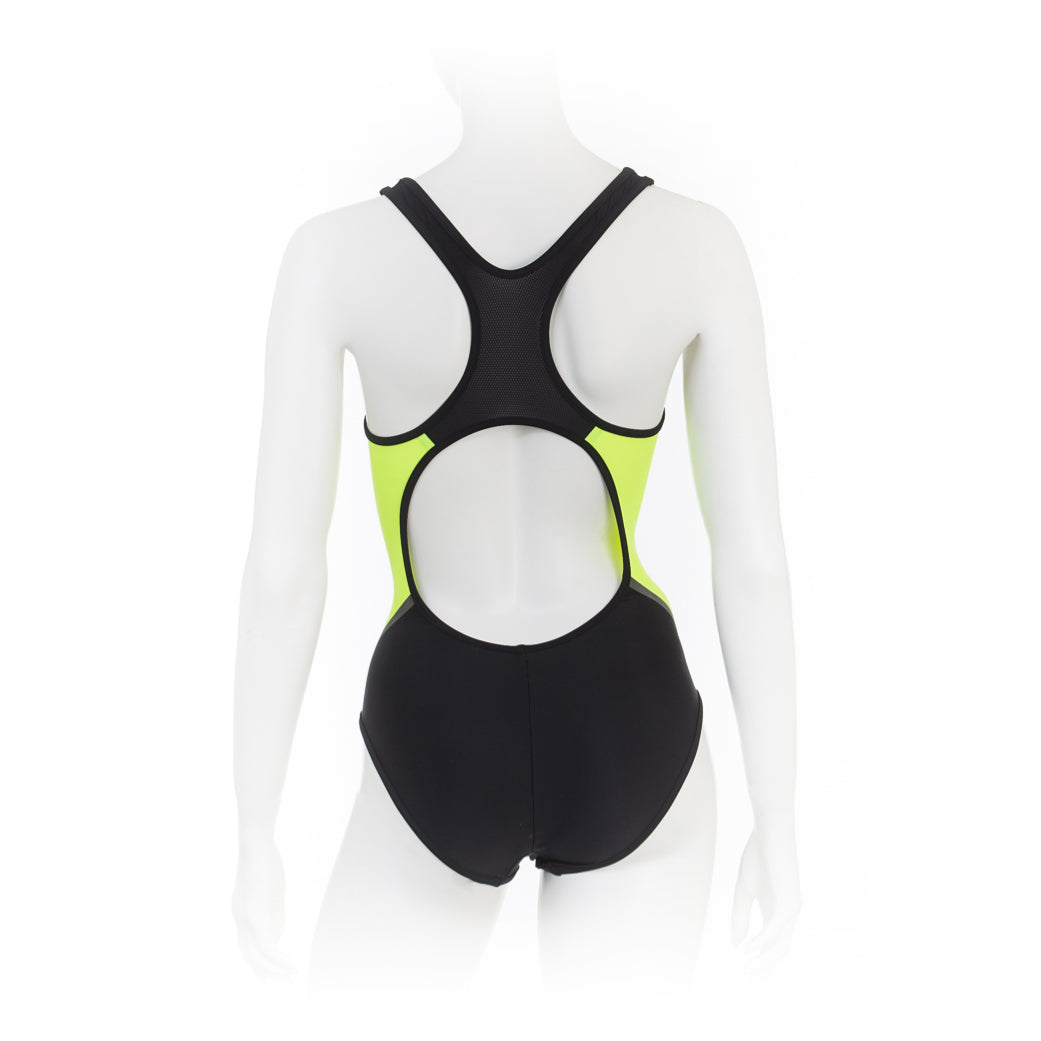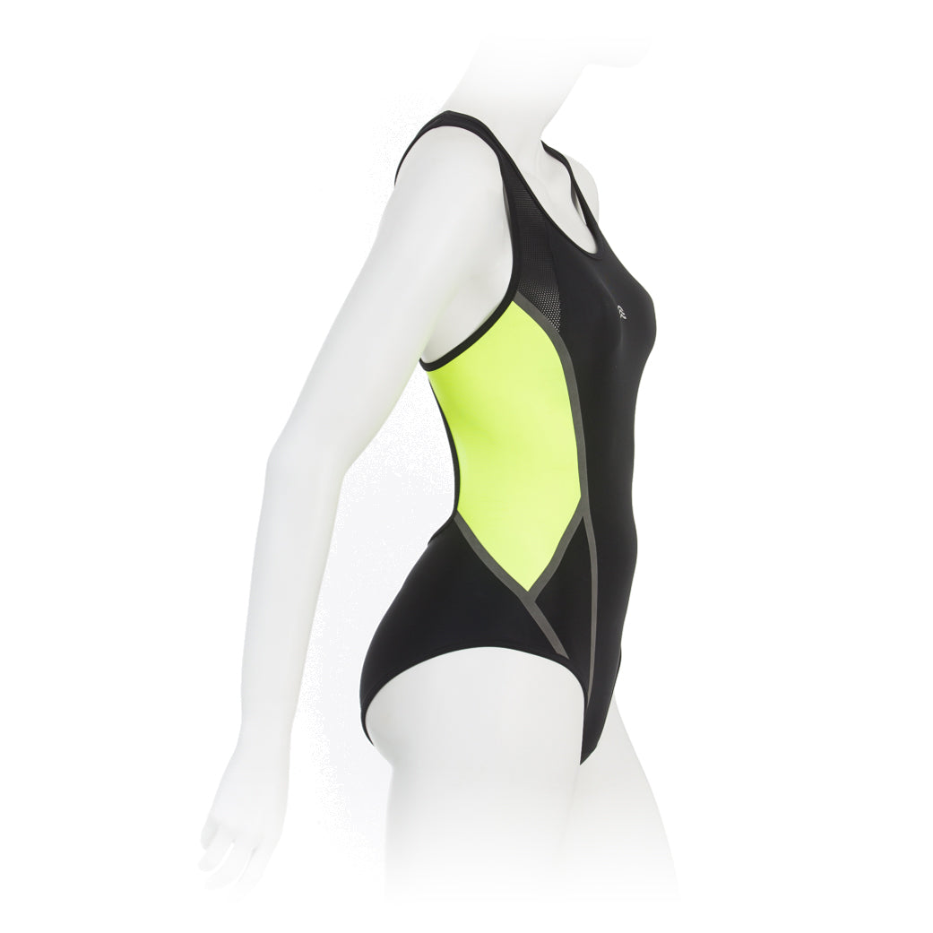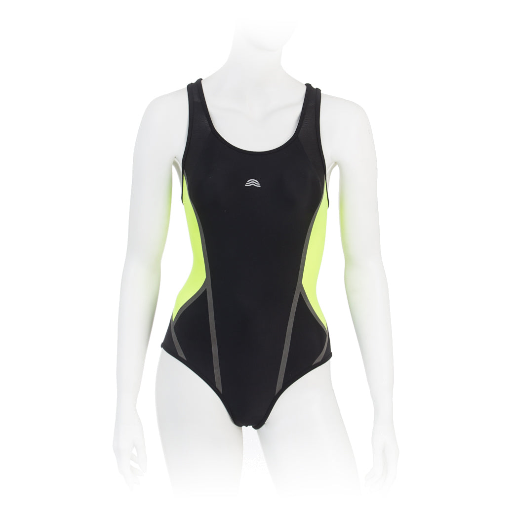 Contrastul dintre negru și inserțiile de galben neon conferă un look modern, potrivit pentru femeile care își doresc să iasă în evidență în apă și să se simtă încrezătoare.