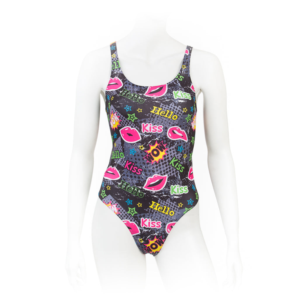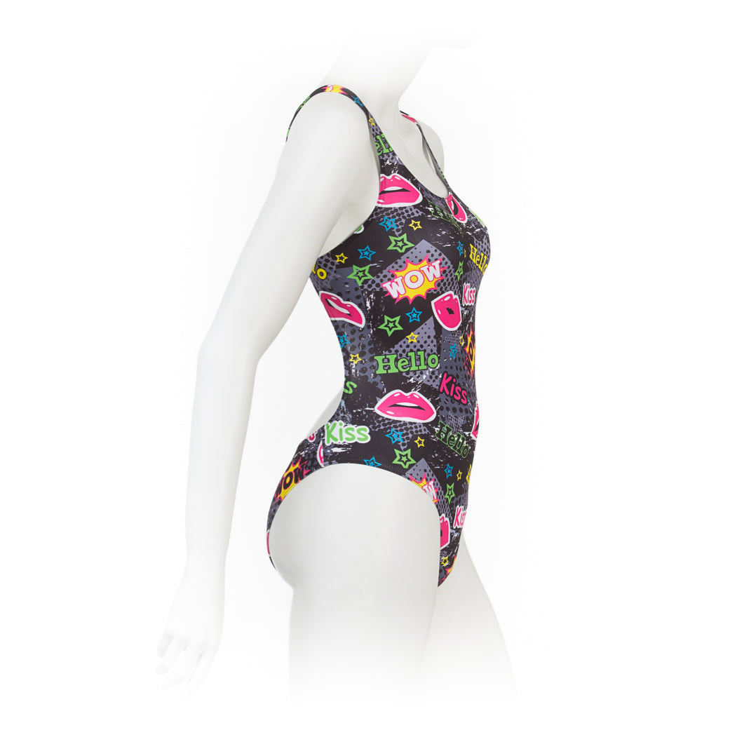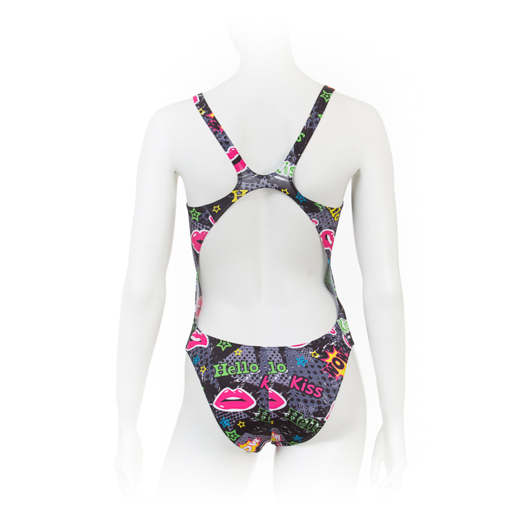 Costumul de înot pentru femei Aquarapid Kris este combinația perfectă între stil modern și funcționalitate, creat pentru performanță și confort. Cu un design vibrant, decorat cu detalii grafice energice și text precum "Kiss" și "Hello", acest costum îți va aduce un plus de încredere atât la antrenamentele de la piscină, cât și în momentele de relaxare la plajă.