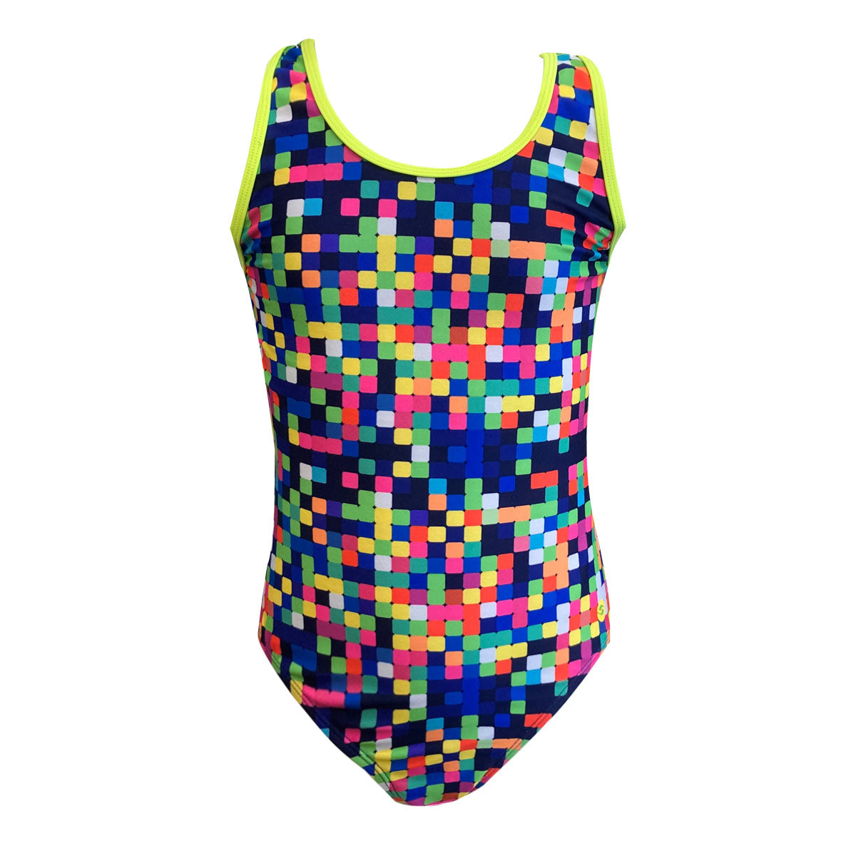 • Design atractiv și modern: Modelul vibrant, inspirat de un mozaic pixelat, aduce un plus de energie și stil în fiecare sesiune de înot. Fetița ta va ieși în evidență în cel mai bun mod posibil!